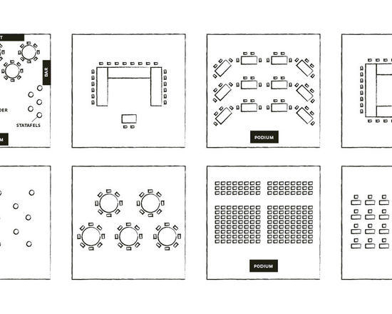 Hieronder een aantal klassieke opstellingen en het benodigde aantal vierkante meter (netto oppervlakte) per persoon als richtlijn.